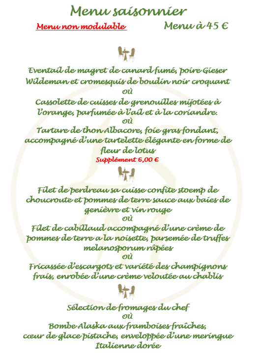Une aventure culinaire avec des plats différents basés sur des produits de saison.